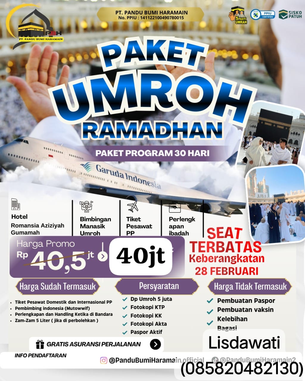 Rizky Umroh kini hadir sebagai mitra resmi (Official Partner) dari Pandu Bumi Haramain. Kami berkomitmen untuk memberikan pengalaman ibadah Umroh dan Haji Plus yang tidak hanya sekadar perjalanan, tetapi sebuah transformasi spiritual yang mendalam.